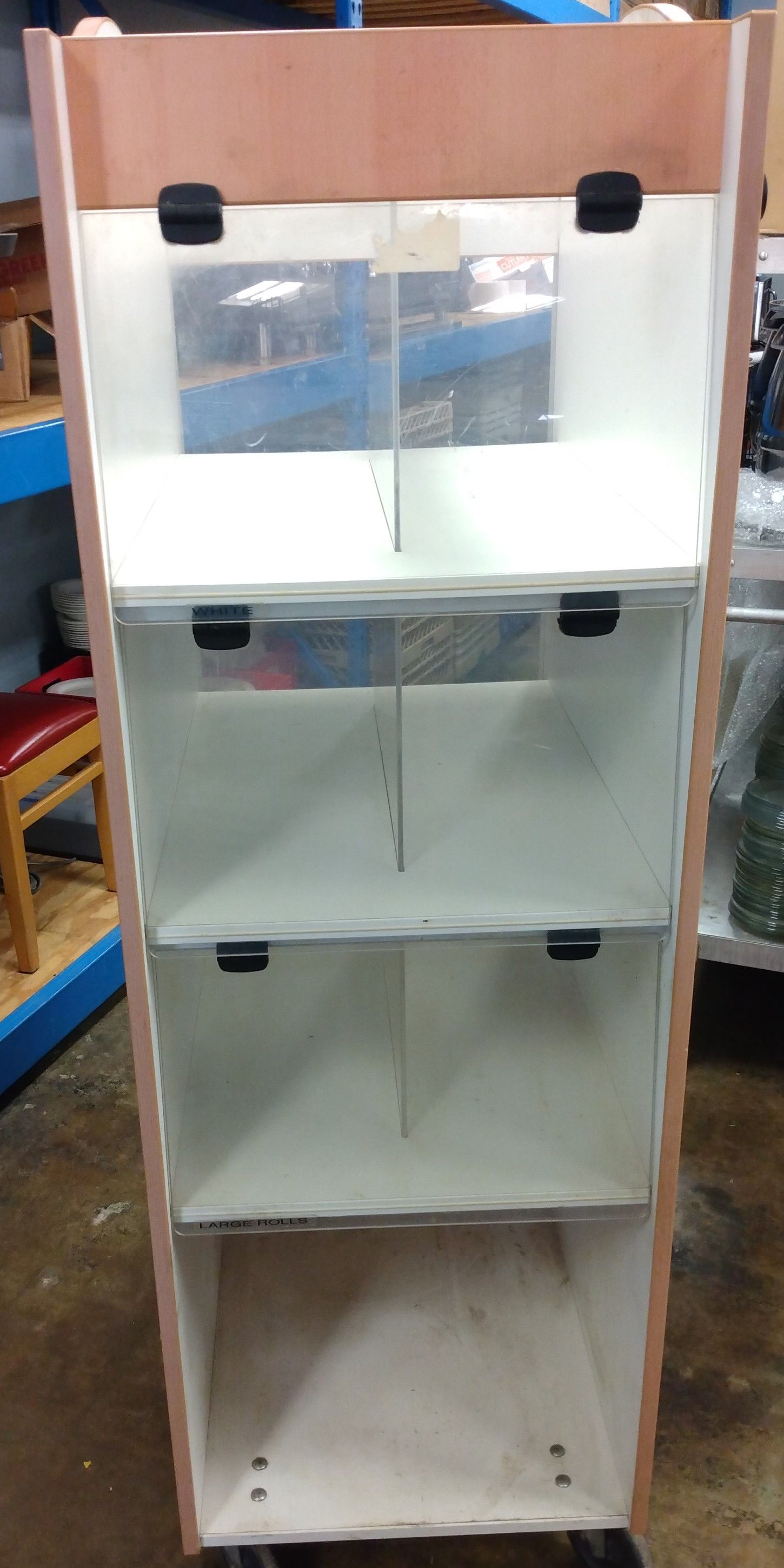 Cabinet for holding and displaying baked goods. Came from a Quiznos. Has no heating or cooling, or lighting of any kind. This is a humble cabinet for storage and display; simple and functional. Still has Quiznos signage on the right side and some labeling on the doors.