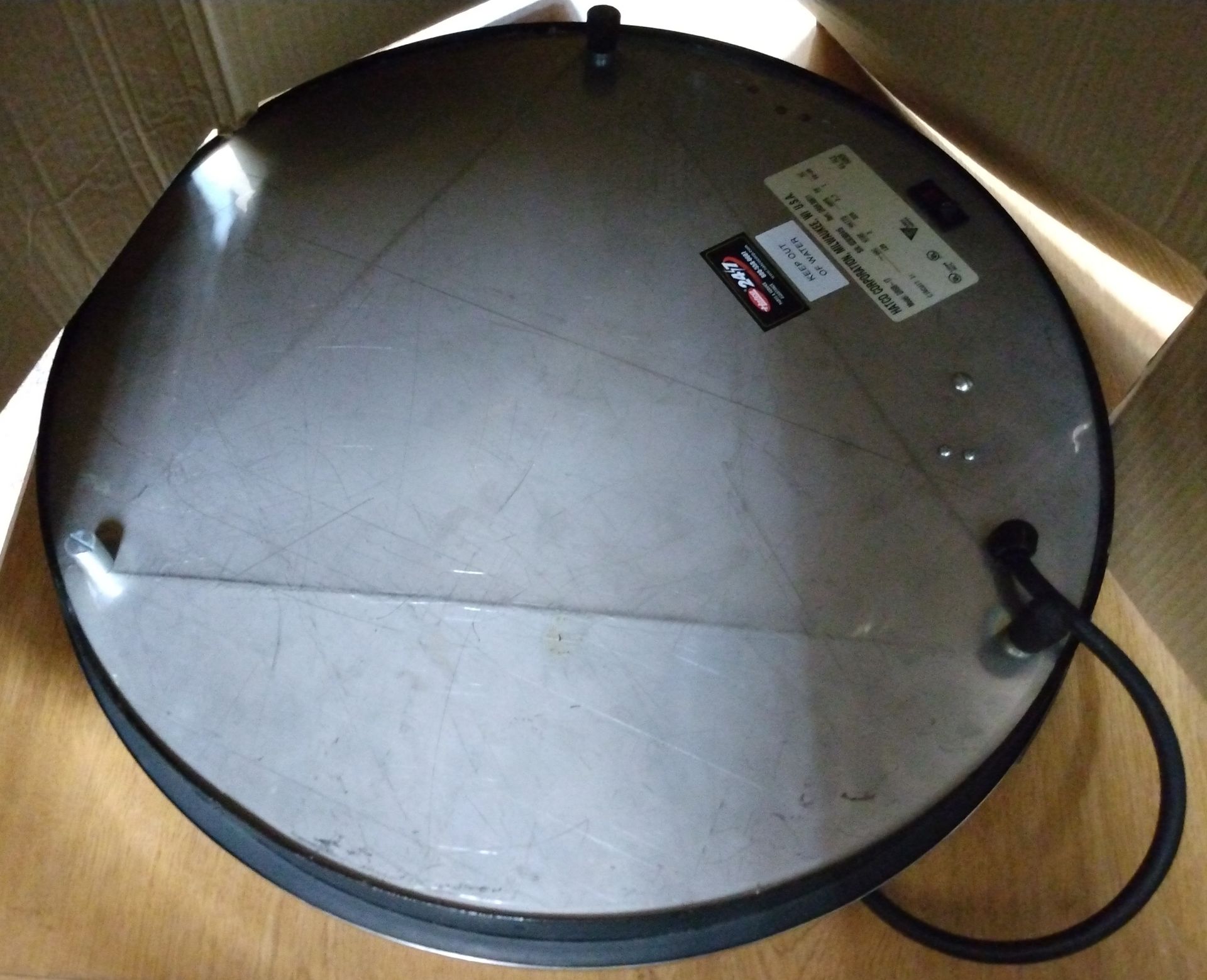 Round, portable, countertop warming shelf designed to hold standard-size pizza pans in place and keep the product sitting on the pan warm. Any pan of similar dimensions should work as well. Three pins hold the pan in place, and the unit sits on three feet. The on/off switch is on the bottom just under the information sticker. This particular model is designed for 17" pizza trays.